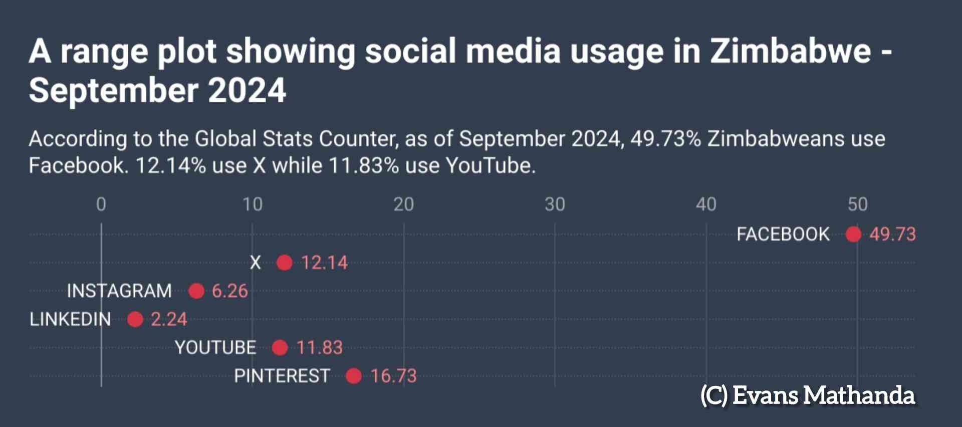 According to the Global Stats Counter, as of September 2024, 49.73% Zimbabweans use Facebook, 12.14% use X while 11.83% use YouTube.