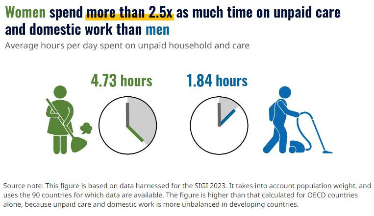 Women work longer hours per day than men and spend more time on unpaid, labour-intensive, and repetitive tasks.