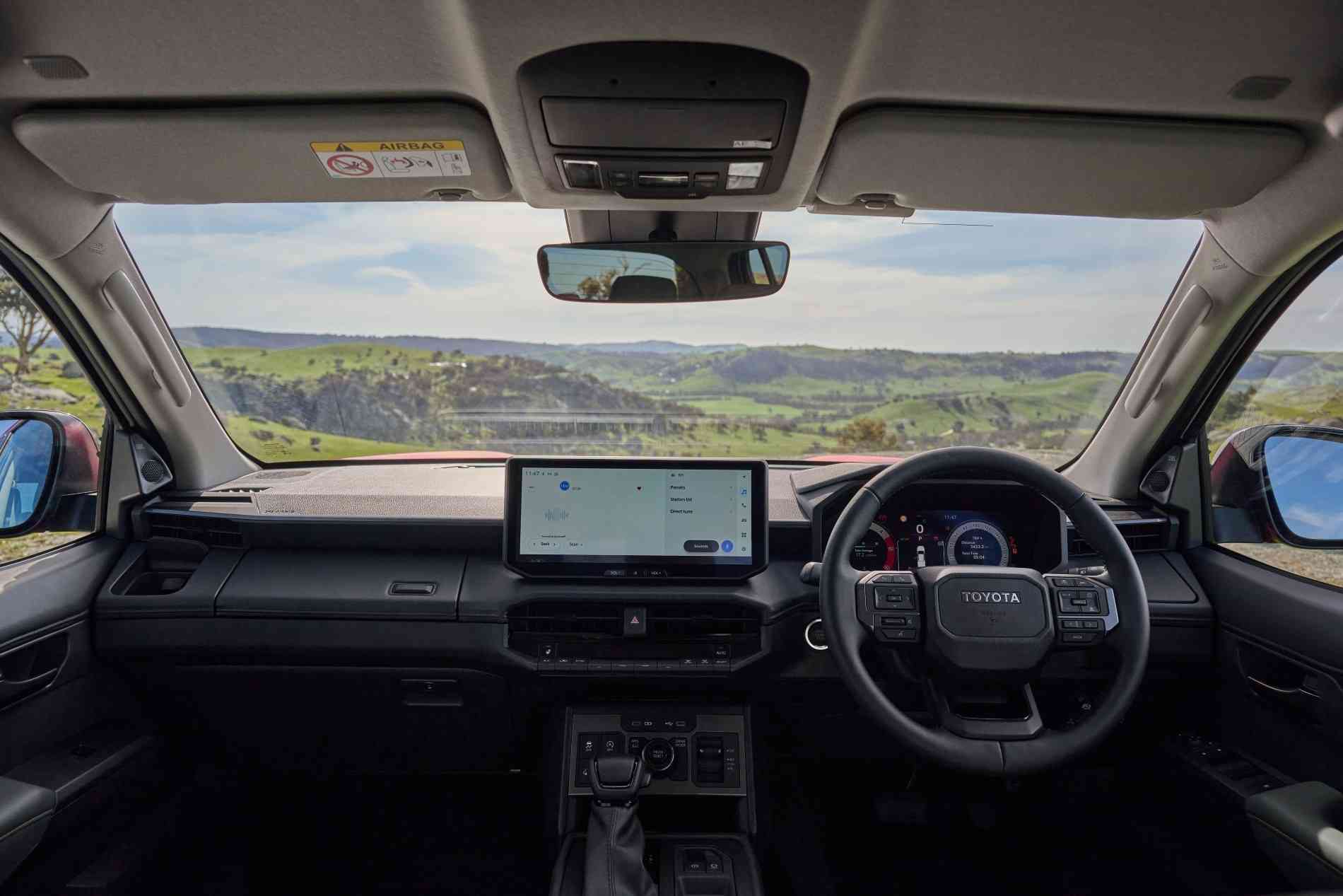 The dashboard features a clean, horizontal design that enhances the sense of space. High-specification models feature a large 12.3-inch floating infotainment touchscreen and a corresponding 12.3-inch digital instrument cluster, bringing the Hilux in line with Toyota's latest SUV offerings like the Land Cruiser Prado.